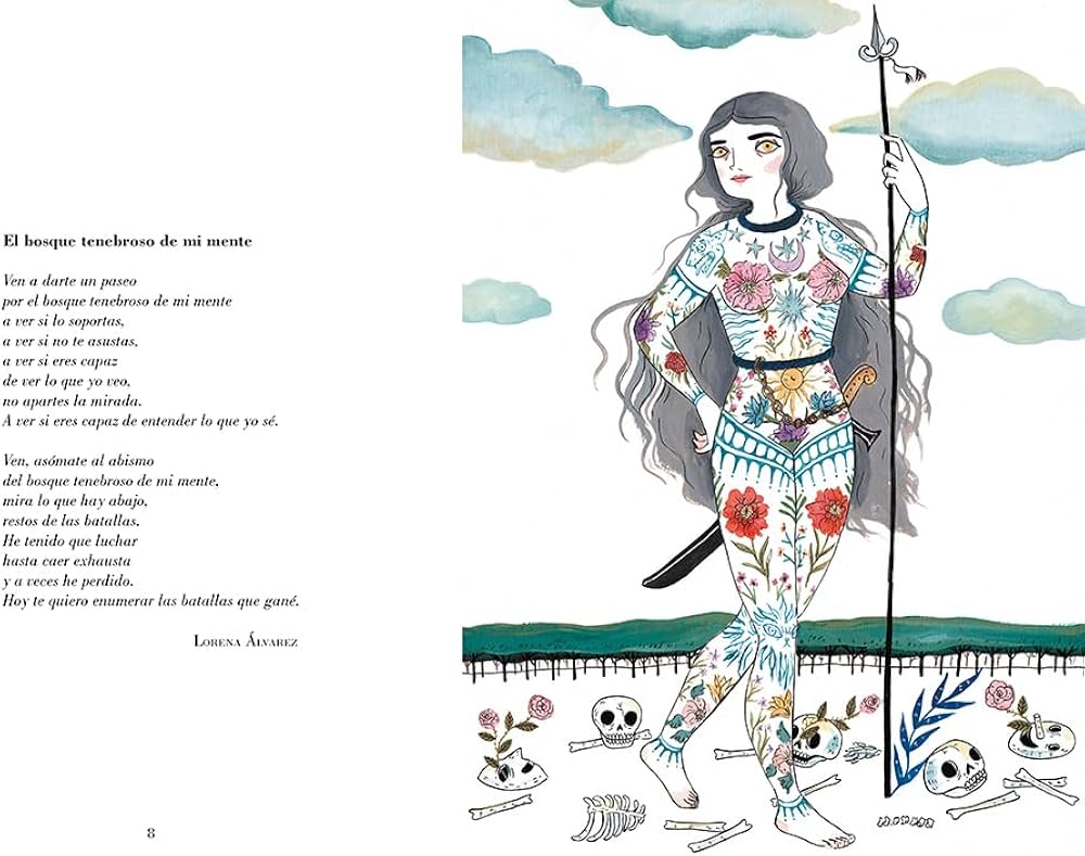 L’autrice parle de ses peurs, traumatismes d’enfance ou séquelles d’une relation amoureuse toxique, qui l’entravent et l’alourdissent, parfois jusqu’à l’asphyxie et la dépression. « Il y a des gens qui, si tu regardes bien, sont des démons déguisés en humains. » (p. 78) D’autres peurs s’accumulent avec le temps : vieillir, mourir, être seule, être mère, ne pas être mère, être une mauvaise mère… « La plupart du temps, j’ai appris à cohabiter avec cet être visqueux et pluriel. J’ai même appris à lui faire face. À leur faire face. » (p. 15) Toutes ces peurs, dont certaines n’appartiennent qu’aux femmes, entaillent son quotidien, son esprit et son âme. Des rameaux jaillissent des plaies : ils sont le prolongement des blessures cadenassées et enracinées, mais aussi le jaillissement d’une nouvelle force. Pour se libérer de ses peurs, Maria Hesse comprend qu’il ne faut pas les museler : il faut les écouter pour les faire taire. « J’ai donc décidé de m’aventurer dans la forêt à petits pas, vaincre la peur de la peur, résister à la tentation de me recroqueviller et de fermer les yeux pour me cacher des loups. » (p. 28) L’artiste laisse s’exprimer la bête sauvage en elle, cette force qu’elle a appris à maîtriser et grâce à laquelle elle sait désormais se protéger. L’autrice rappelle aussi l’importance de savoir s’entourer : il y a des combats que l’on ne peut pas mener seul e. « J’ai alors compris qu’une amie, c’est une liane qui sert à s’extraire des sables mouvants. » (p. 138)
